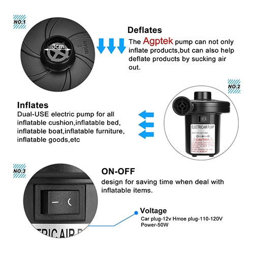 Multi-Purpose -- Including car power adapter & home power adapter. This inflatable mattress pump is a powerful inflator and deflator for both indoor and outdoor use, especially for travel and outdoor activities. AGP TECK air pumps helps you saving time on inflating air cushions, air beds, air boats, inflatable furniture, swimming ring and more!