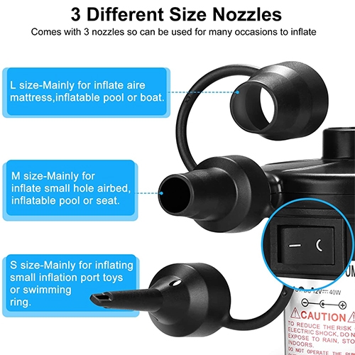 3 Nozzles to Choose -- We have 3 nozzles of different size in the electric air mattress pumps – S, M and L, allowing you to inflate/deflate different items in any occasions!